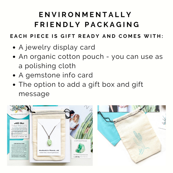 Each piece is consciously created by hand, using sustainable and environmentally friendly materials. Whether you’re purchasing for yourself or someone else, you will love the way your jewelry arrives perfectly wrapped and ready for gifting.