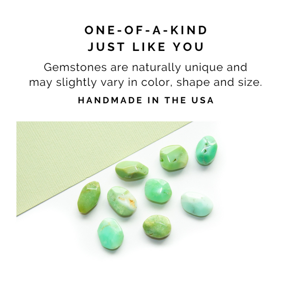A minty chrysoprase faceted gemstone takes center stage to create a timeless and simple everyday look. Harness the power of chrysoprase for feelings of love and forgiveness.