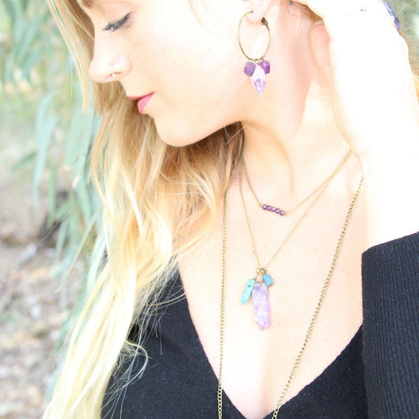 You will love this amethyst, Amazonite, and apatite necklace. Named the "cluster" as it is a gorgeous combination of the galaxy's finest jewel tones in one piece; purple amethyst, light blue Amazonite, and dark blue apatite.